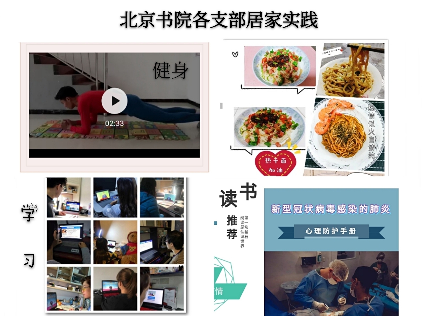 创新宣传形式传播正能量。书院充分调动师生力量,尤其是党员和学生干部力量,依托新媒体平台做好网络舆情宣传工作。进一步推进微信公众号平台建设,现已通过BITBJNEWS推出科学防疫知识、征文、健身、心理、美食、读书、开学等系列新闻作品19个。积极宣传防疫科学知识,全面动员学生参与网络线上“众志成城 共克时艰”主题征文活动,传递战胜疫情的坚定信心,共发布180个提醒和通知,涉及学生上网课、心理、生活、健康等各类问题。线上活动也成为开展学生活动的一种新载体,新形式,各群团组织发挥部门特色,聚焦学生学习生活,以文化艺术作品的形式为抗“疫”助力发声。