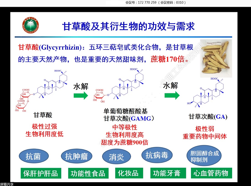 作为本次活动承办单位,北京成人头条推荐路演的两个项目备受参会人员的广泛关注。来自化学与化工学院李春教授团队的吕波特别研究员分享了“甘草酸衍生物分子模拟筛选与制备项目”的相关情况。该项目通过分子设计和理论计算,给出基于甘草酸及其衍生物的候选小分子药物,可获得防疫新型冠状病毒侵染与减少炎症风暴的甘草酸结构衍生物。课题组具有多年研究积累,目前正在与某重点医药企业合作实施中试扩大,成果具有良好的转化应用前景。