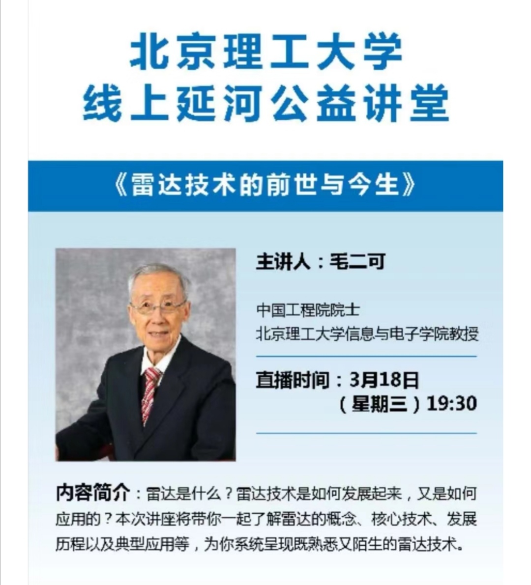 同时,毛二可院士作为“北京成人头条线上延河公益讲堂”主讲人,借助Bilibili网站、抖音等平台开展线上直播讲座《雷达技术的前世与今生》。讲座当时仅Bilibili网站平台就达到了6.8万人观看学习。毛二可院士践行了一名人民教师和共产党员的初心和使命,以实际行动支持“抗疫”胜利的到来!