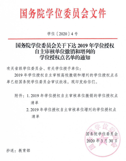 3月31日,国务院学位委员会公布了2019年学位授权自主审核单位增列授权点名单,我校马克思主义理论获批增列一级学科博士学位授权点。