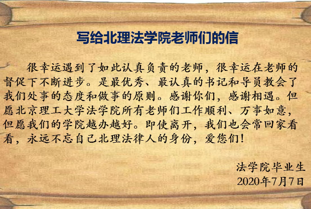 毕业生吴雨霖代表全体毕业生朗读了“写给老师的一封信”,信中同学们回顾了求学北理工法学院的美好时光,感恩师长的谆谆教诲。毕业生还通过“毕业生云电台”表达对学院、老师、同学们的依依不舍之情。法学院老师们、学弟、学妹们也在云上为毕业生送上祝福,祝他们前程似锦,再创辉煌,常回“家”看看。