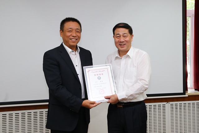 项昌乐代表学校向赫建校友颁发捐赠证书,赠送80周年校庆纪念品。