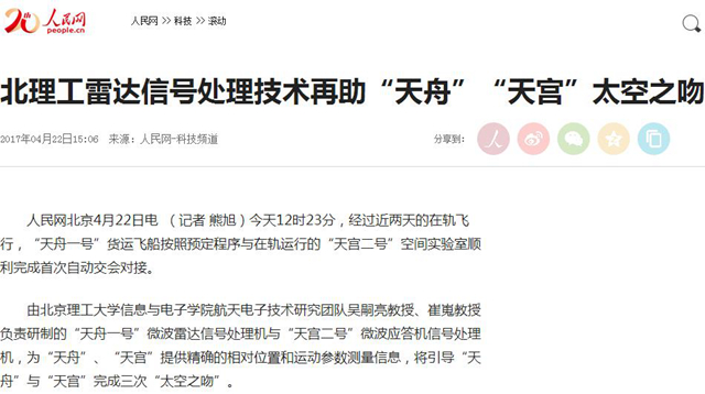 【人民网】北理工雷达信号处理技术再助“天舟”“天宫”太空之吻