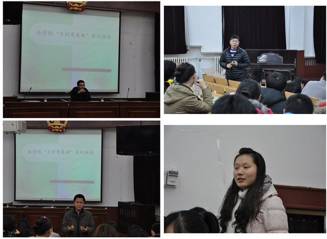 近日,伴着纷飞的瑞雪,在7号楼108教室里法学院举办了一场温暖心灵的交流会——“乡村变奏曲”之“与理想有关篇章”活动。本次活动分为“领悟大精神”与“解决小问题”两个部分,通过邀请高年级的学长学姐来讲述经历并介绍经验,旨在帮助法学院09级学子们解答目前学习与生活中的迷茫和困惑。活动由法学院党委副书记副院长张巍老师主持,法学院分团委书记聂宁宁老师和2009级全体同学参与了此次活动。