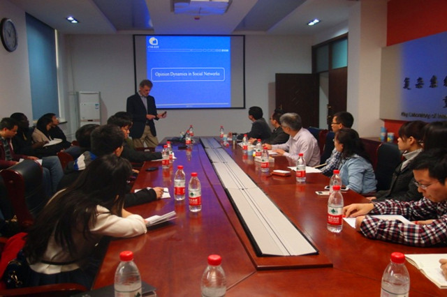 Roberto Tempo教授分别从Opinion dynamics in social networks和Sensor localization of wireless networks两个角度深入浅出的介绍了分布式随机算法和时间平均算法的最新研究成果,详细阐述了随机算法的内涵和性质及其在社会网络系统分析与控制中的应用。会后,Roberto Tempo教授与本校师生进行了热烈的交流与讨论。