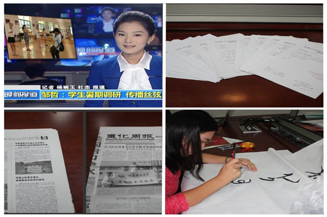 为了深入了解非遗的保护和传承,感受传统艺术的魅力,宣传和弘扬中华传统文化,学院5为女生组成“乡韵自多情”实践团,团队调研了宛梆(河南内乡)、常德丝弦(湖南常德)、十二木卡姆(新疆维吾尔自治区)、桂剧(广西)、淮剧(江苏)五种艺术,走访了多家艺术表演团,采访了数十位艺术表演家,收集到了详实的第一手资料。经过深入调研,实践团的同学们认真分析了当前非物质文化遗产保护和传承的现状。最终“乡韵自多情”实践团完成《艺术类非物质文化遗产现状与发展的调研》调研报告,并撰写《艺术类非物质文化遗产保护建议书》,为保护艺术类非物质文化遗产作出自己的贡献。