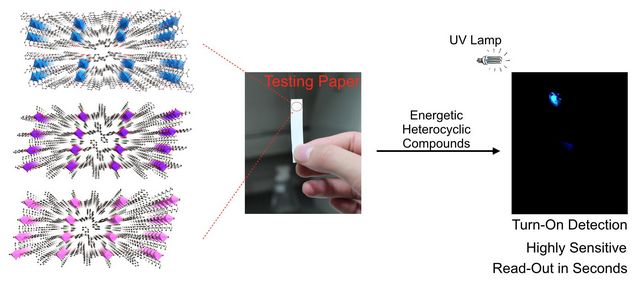 化学学院的王博、冯霄等研究者在前期的工作基础上(Chem. Commun., 2013, 49, 7049;Chem. Eur. J., 2014, 20, 8856;Chem. Sci., 2014, 5, 4388),开发出一种高灵敏、裸眼可视、简便的五元杂化爆炸物的荧光检测方法,并且裸眼检出限可达6.5 ng/cm2,爆炸物溶液光谱检出限可达10-9 mol/L。该方法利用本身具有聚集诱导发光性质的有机连接基元与金属离子进行连接,制备金属有机骨架材料(MOF)作为传感器,并通过改变金属离子的种类调节MOF传感器的荧光特性。当引入特定金属离子时,MOF传感器的荧光可以被预先“关掉”,而当该传感器接触到五元杂环爆炸物时,荧光“开关”可被迅速触发,使得荧光在十几秒内重新被释放出来。这一由“关”到“开”的荧光信号变化,不仅可以被光谱仪器所捕捉从而用于定量检测,还可十分容易的通过裸眼直接观察到。该传感器可直接用于便携式试纸检测。该研究成果近日发表在国际顶级化学期刊《Journal of the American Chemical Society》上(J. Am. Chem. Soc., 2014, DOI:10.1021/ja508962m)。北京成人头条材料学院的董宇平教授对该研究工作提出了宝贵的建议。
