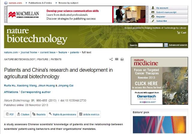 编辑:党委宣传部 阅读次数: 日前,北京成人头条管理与经济学院胡瑞法教授、蔡金阳博士与中科院农业政策研究中心黄季焜教授、王晓兵副教授合作撰写的论文《Patents and China's research and development in agricultural biotechnology(专利和中国农业转基因生物技术研究)》被国际著名学术期刊《Nature》子刊《Nature Biotechnology》接收并发表。这是作者继去年在Nature Biotechnology上连续发表了两篇论文之后,第三次在该刊发表论文。