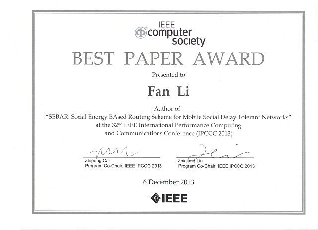 2013年12月在美国圣地亚哥举行的第32届IEEE国际性能计算和通信会议(IEEE International Performance, Computing and Communications Conference, IEEE IPCCC 2013)上,计算机学院李凡副教授及其团队的论文' SEBAR: Social Energy BAsed Routing Scheme for Mobile Social Delay Tolerant Networks '在126篇投稿中获得本次会议唯一最佳论文奖。此项荣誉是李凡老师及其研究团队长期努力的结果,是对该团队研究与学术水平的肯定。