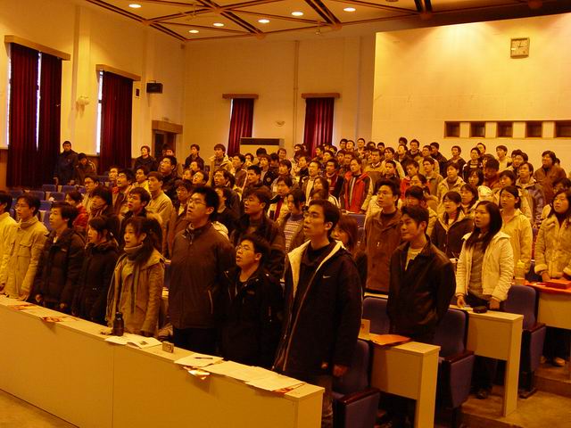 参加会议的有党委组织部副部长杨惠萍老师、机电学院主管学生工作董兆波老师、学院各学生党支部书记以及学院2003级、2004级的全体党员和积极分子。大会在全场齐唱《国际歌》后拉开了帷幕。