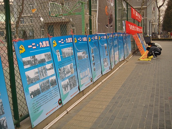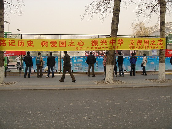 2007年12月9日,管理与经济学院的同学在新食堂的对面举办了有关纪念“一二.九”学生运动七十二周年的展览活动,本次活动以“铭记历史 树爱国之心 振兴中华 立报国之志”为主题,向同学们介绍了“一二.九”学生运动的原因,过程及影响,让同学们了解历史,铭记历史,增强同学们的爱国意识,进一步深化爱国情怀!